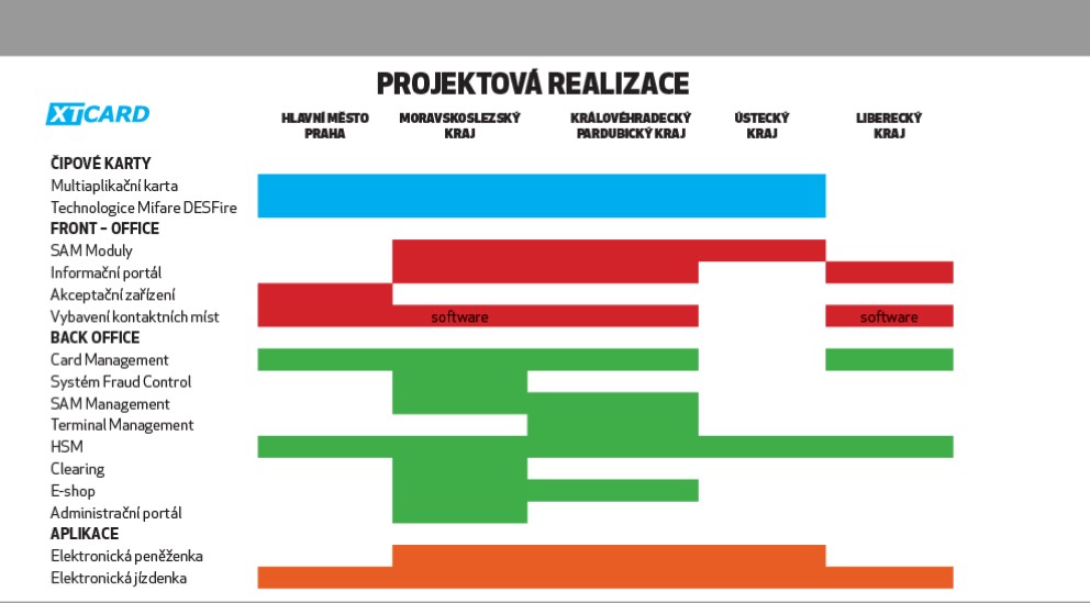 Společnost XT-Card se díky svým dlouholetým zkušenostem z projektů jako je In-karta Českých drah nebo ODISka v Moravskoslezském kraji specializuje na komplexní dopravní řešení. V současné době se XT-Card podílí na dopravních systémech v 5 krajích České republiky. V přehledu níže je uveden podrobný přehled všech krajských dopravních řešení, která XT-Card samostatně nebo ve spolupráci s regionálními koordinátory dopravy dodal či dodává.